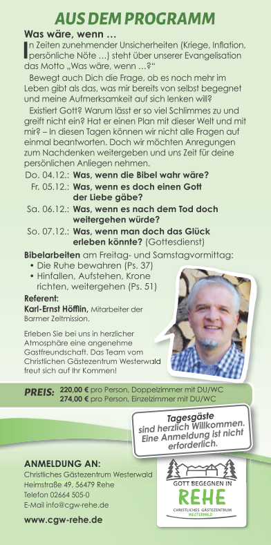 Herzliche Einladung zur Veranstaltungsreihe im CGW Rehe vom 4.-7. Dezember. Wer in der Region wohnt, kann gerne zu den Veranstaltungen kommen – Tagesgäste sind ohne Anmeldung willkommen!